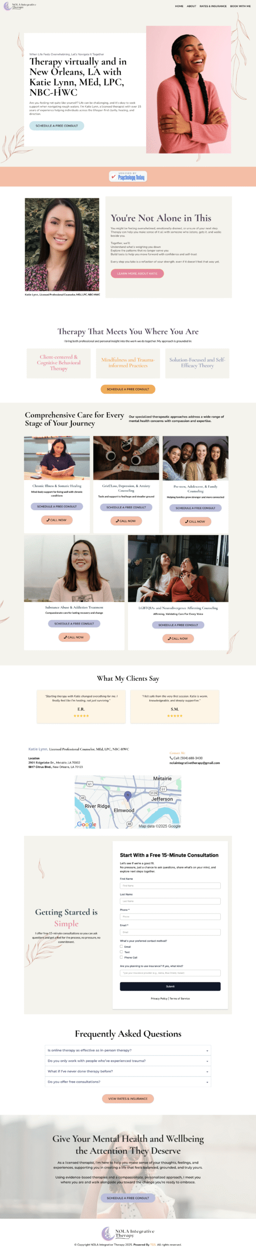 A modern website built for Therapy virtually and in New Orleans, LA with Katie Lynn, MEd, LPC, NBC-HWC